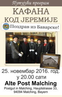 Путујући програм "Кафана код Јеремије" гостовао је крајем новембру месеца 2016. год. у баварском месту Малхингу, у кафани "Алте Пост". Тај познати угоститељски објекат датира још из 1436. године и налази се под заштитом немачке државе.
